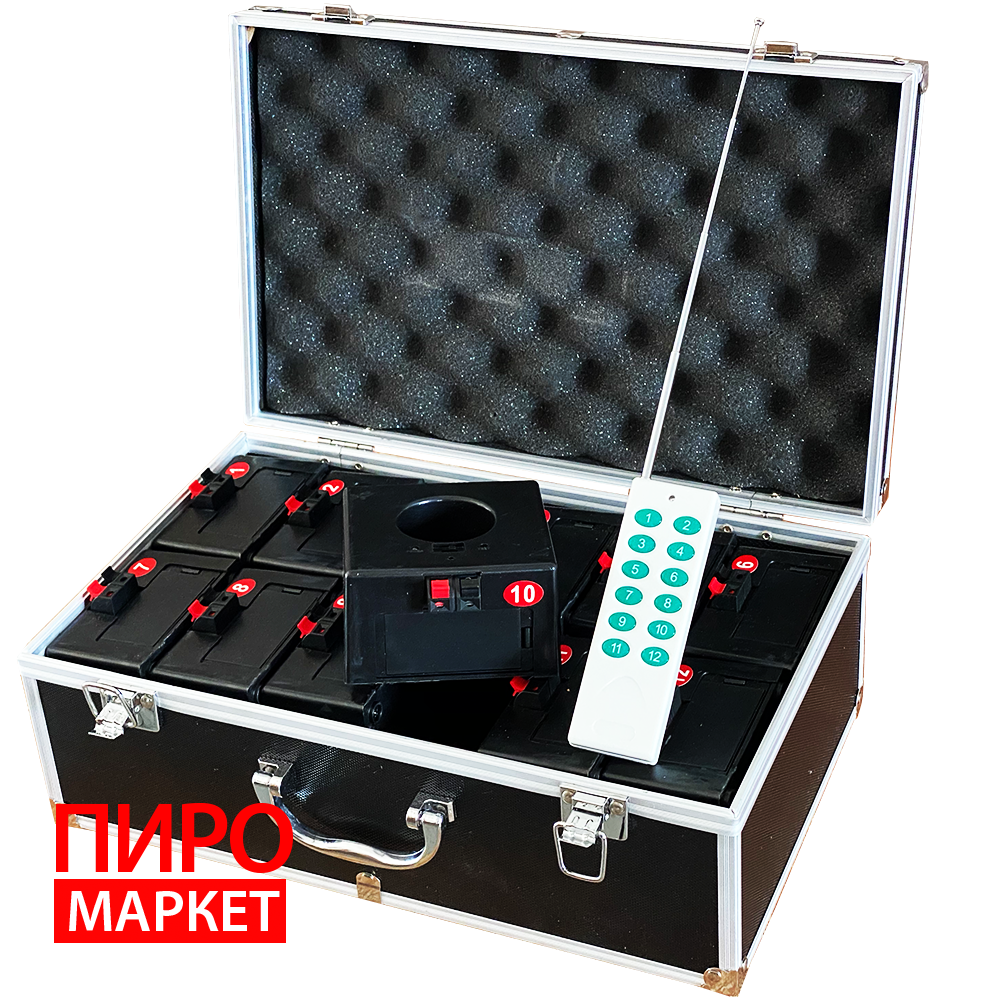 Пульт дистанционного запуска сценических фонтанов D12 состоит из 12 дистанционных блоков и 2 пульта дистанционного управления. С помощью первого ДУ можно запустить все блочки одновременно, другим каждый блочок по отдельности. Также в комплект входит удобный кейс, в который вмещается все оборудование.