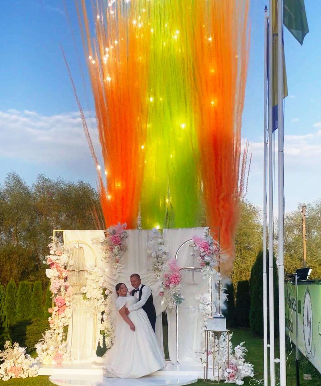 Выстрел цветным дымом на церемонию бракосочетания – это эффектный способ подчеркнуть праздничность события и добавить эмоции в нужный момент. Такой элемент лучше использовать когда ведущий говорит: "Объявляю вас мужем и женой" и в небо выстреливают столбы цветного дыма создавая волшебный насыщенный фон сзади невест.